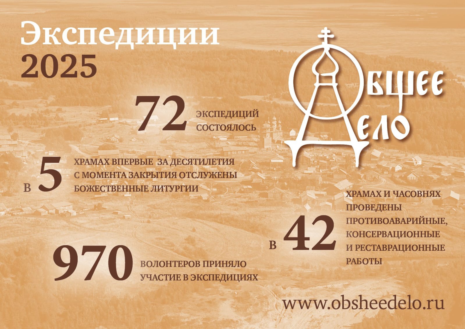 В минувшем трудовом сезоне у нас состоялось 72 экспедиции, в которых приняло участие 970 добровольцев. Мы провели работы в 42 храмах и часовнях на Русском Севере. В 5 храмах, впервые с момента их закрытия, были отслужены Божественные литургии.