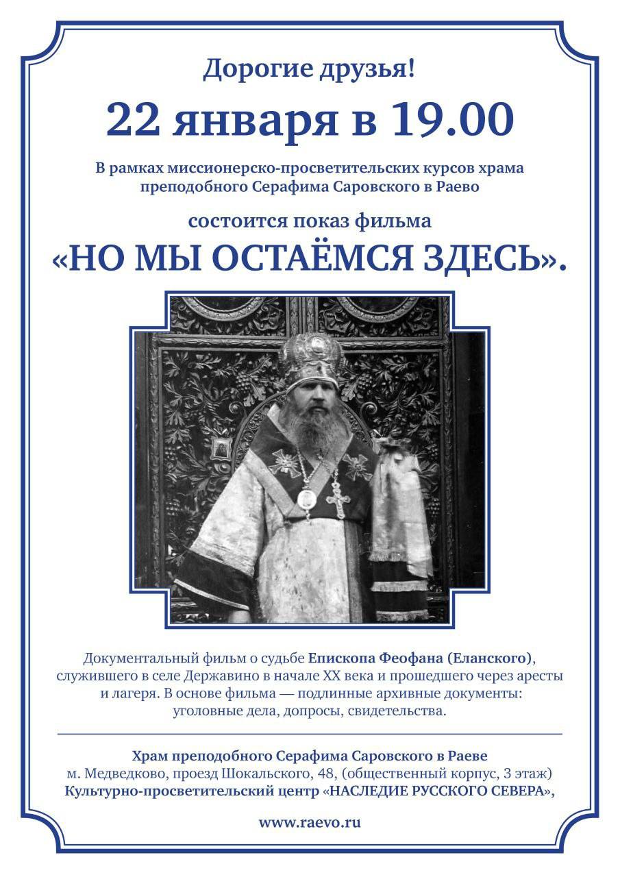 Друзья, приглашаем вас 22 января в 19:00 на показ документального фильма «Но мы остаёмся здесь» — о судьбе епископа Феофана (Еланского), основанный на подлинных архивных документах. Будем рады видеть вас.