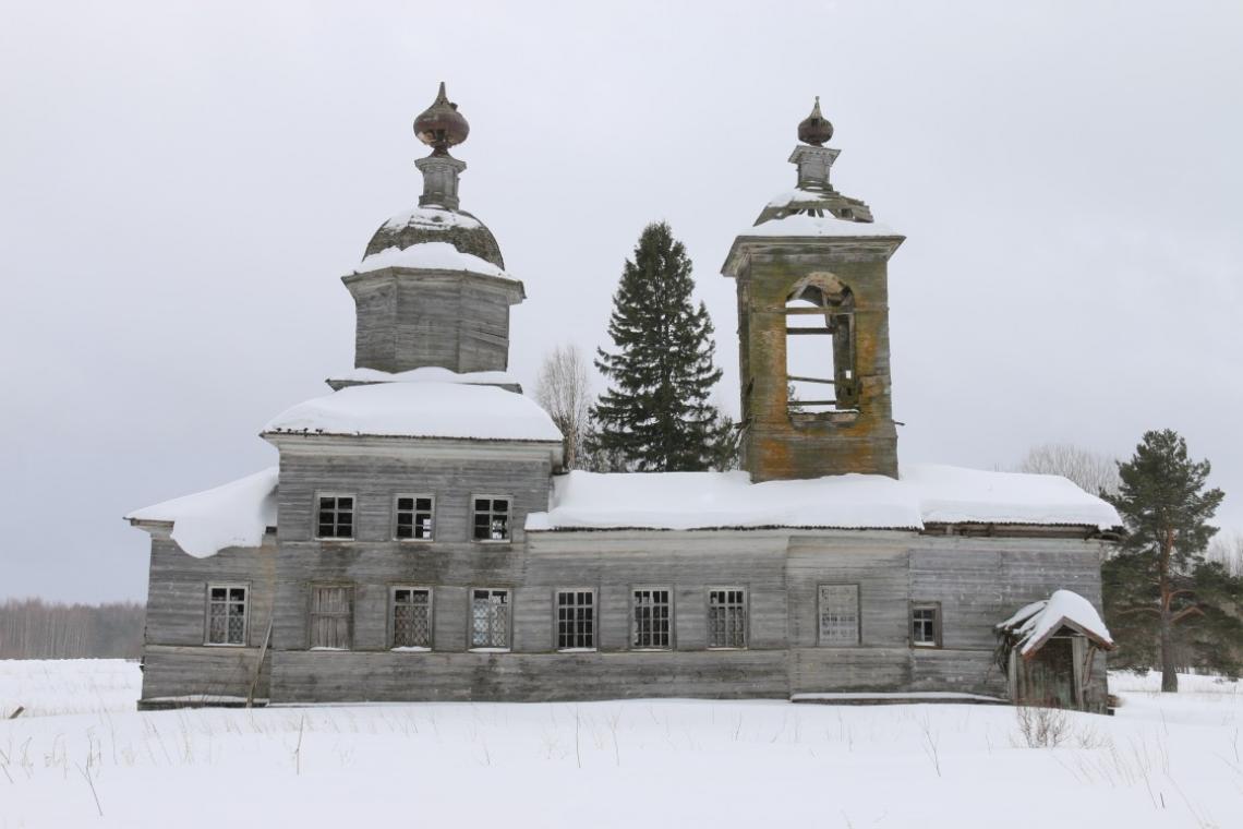 Основное помещение храма является доминантой объемов и представляет собой высокий четверик, освещенный двумя ярусами окон (по три окна в каждом ярусе, обращены на север и юг). Перекрыт четверик на четыре ската тесом. Венчает его глухой объем восьмерика. В интерьере храма восьмерик никак не прочитывается. Завершает восьмерик полукруглый купол, перекрытый кровельным железом. На него поставлен декоративный восьмеричок, украшенный по ребрам пилонами с импровизированными капителями. Восьмигранный карниз юбки главки, нависающий над восьмеричком, украшен дентикулами (сухариками). Отголоски классицизма встречаем мы в этих незаурядных элементах. Интересно, что автор использует подобные детали для украшения на такой высоте, с которой они не слишком примечательной человеческому глазу. Завершает все главка, покрытая пластинами кровельного железа, на тонкой восьмигранной ножке (железо на главке местами отсутствует, да и сама её конструкция не сохранилась в исконном виде). Креста в завершении нет.