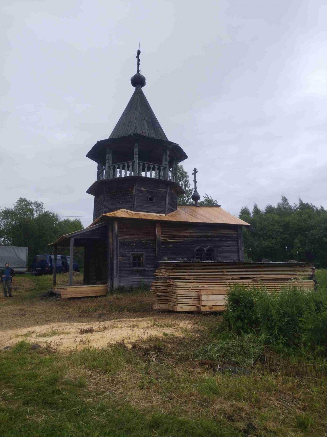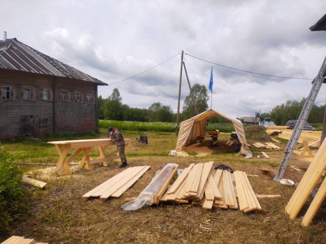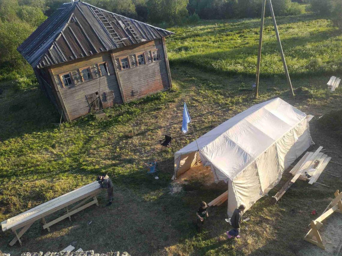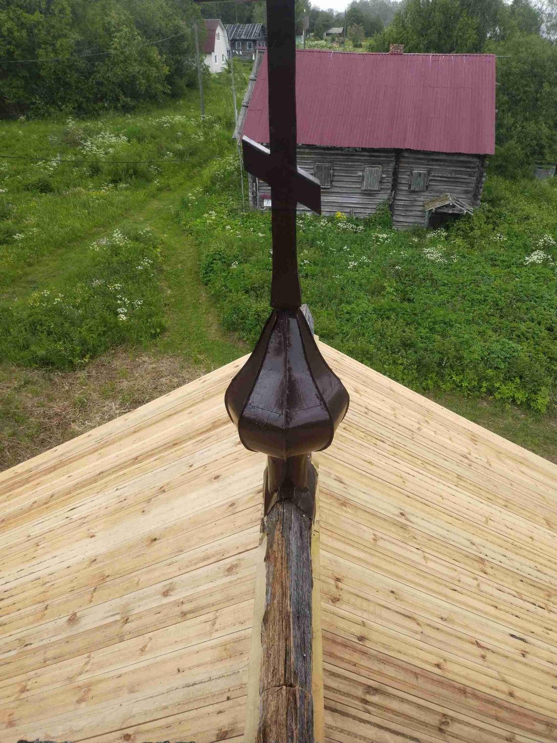 – проведены работы по установке консервационных кровель на основном объеме и крыльце: демонтированы сгнившие тесины, фрагментарно укреплен («вычинен») верхних венец, уложены: нижний ряд доски, профнастил и верхний ряд дороженой доски;
