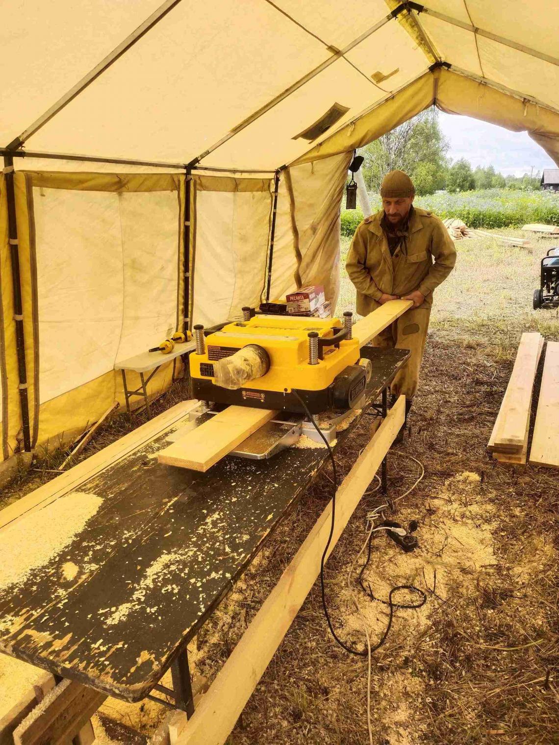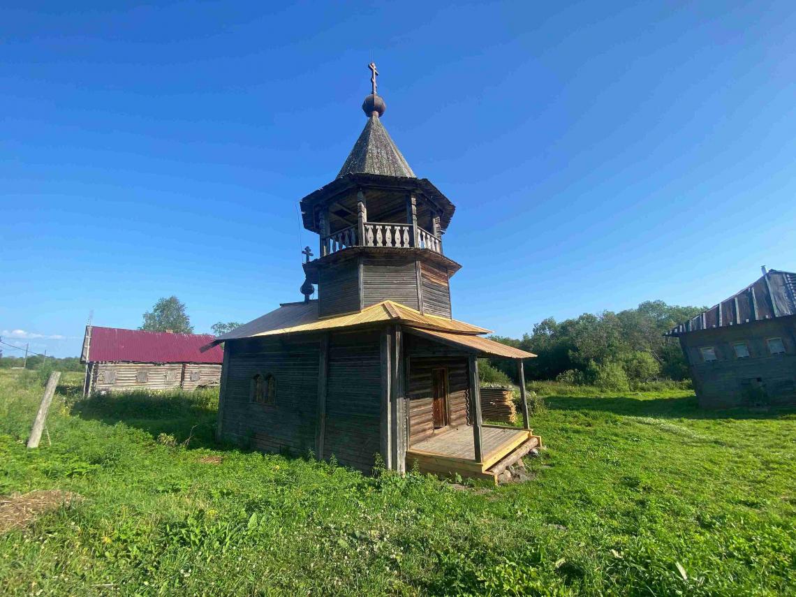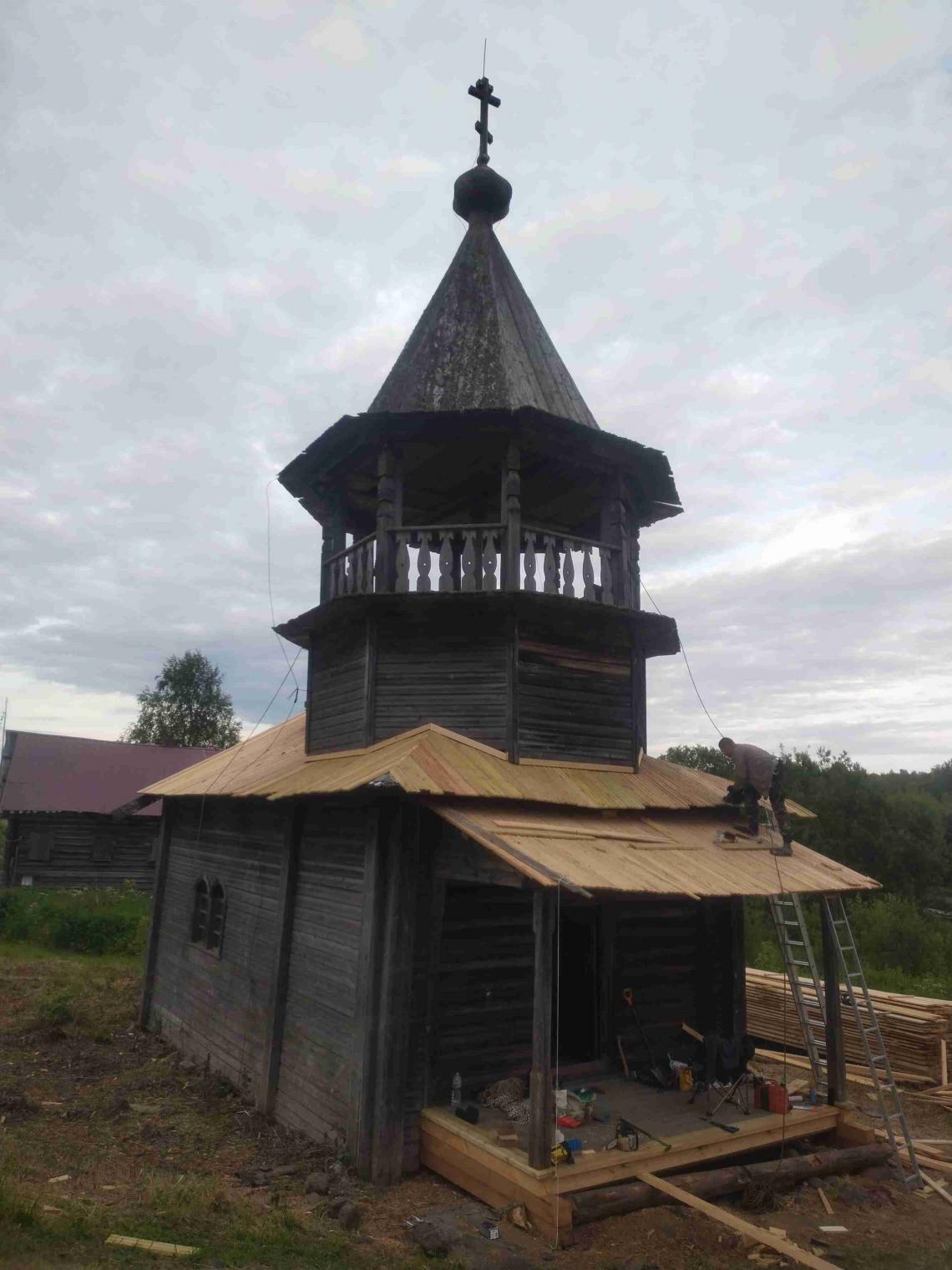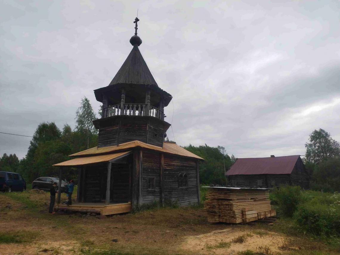 – проведены работы по установке консервационных кровель на основном объеме и крыльце: демонтированы сгнившие тесины, фрагментарно укреплен («вычинен») верхних венец, уложены: нижний ряд доски, профнастил и верхний ряд дороженой доски;